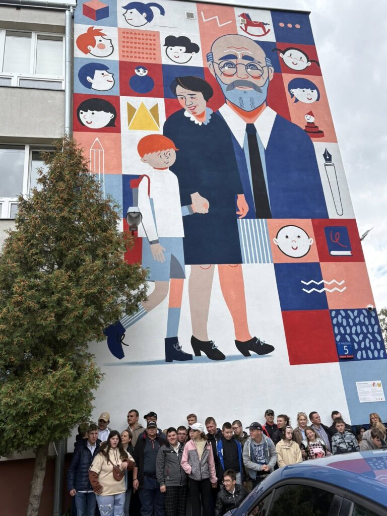 17 września 2025 r. Stowarzyszenie INNI zorganizowało wspaniałą wycieczkę do Warszawy. Była to druga taka wyprawa w ramach projektu „Nasz czas” dofinansowanego przez Miasto Brzeziny. W wycieczce wzięli udział chętni uczniowie szkół oraz absolwenci PZSiPO, którzy należą do stowarzyszenia. W programie wyjazdu znalazła się wizyta w Szkole Podstawowej nr 195 im. Króla Maciusia I w Warszawie, gdzie zostaliśmy serdecznie przyjęci przez koło wolontariatu. Uczniowie pokazali nam sztandar szkoły, kącik Patrona, pamiątki zachowane z uroczystości nadania imienia szkole oraz szkolne kroniki. Czytali fragmenty autorskich periodyków tworzonych przez uczniów szkoły na temat Janusza Korczaka i jego dzieł. Wizyta zakończyła się pamiątkowymi zdjęciami wykonanymi pod muralem zdobiącym ścianę SP nr 195 w Warszawie, na którym znajduje się wizerunek Korczaka i Stefanii Wilczyńskiej. Ciekawym przystankiem w trakcie wycieczki były odwiedziny przy muralu Króla Maciusia I zdobiącym ścianę pobliskiej biblioteki publicznej. Ta część wycieczki do Warszawy wpisała się w obchodzony w szkole Tydzień KORCZAKOWSKI, który przygotowuje społeczność uczniowską do nadania imienia szkole podstawowej.