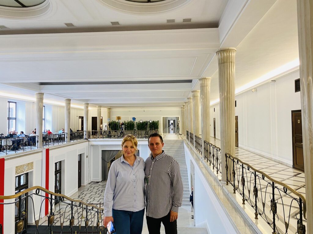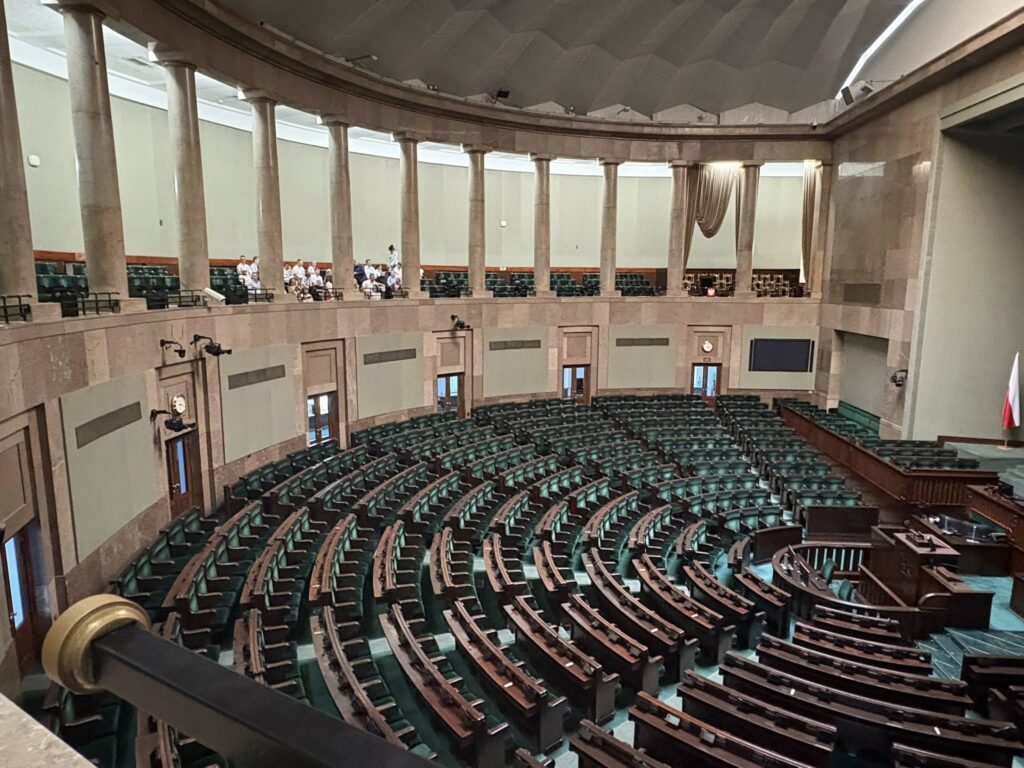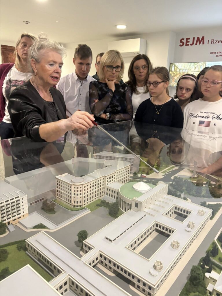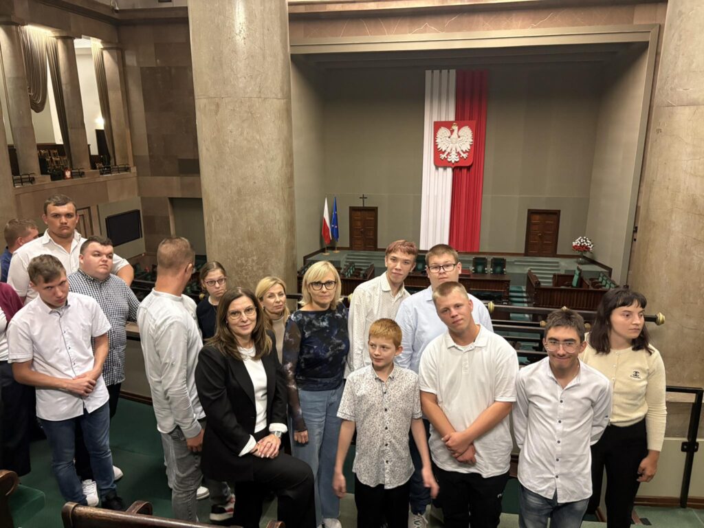 Drugim bardzo ciekawym punktem programu była wizyta w Sejmie Rzeczypospolitej Polskiej. Uczestnicy wyjazdu mieli okazję poznać krótką historię rządów parlamentarnych w naszym kraju. Obejrzeli makietę budynków parlamentu i wystawę poświęconą historii tego miejsca. Najciekawsza jednak była wizyta w sali obrad sejmu, gdzie uczniowie wysłuchali ciekawej prelekcji o obradach, zwyczajach związanych z ich ceremoniałem oraz wielu sejmowych ciekawostek. Wizyta w sejmie zakończyła się pamiątkowym zdjęciem na marmurowych schodach oraz spacerem po sejmowych kuluarach. Każdy uczestnik wyjazdu otrzymał również pamiątkowe grafiki, notesy i ołówki z logotypem Sejmu RP. Odwiedziny w sejmie to ważna część wychowania obywatelskiego, które jest jednym z priorytetów MEN w bieżącym roku szkolnym.